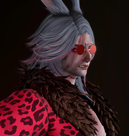 Ever-clad in his obnoxiously bright fur coat, shaded glasses and half-open shirt, brandishing a rifle painted neon violet, Rjego Rejtem is one of those people. Blessed with a unique – if paradoxical – combination of personality features, somehow possessing both an astounding mind and the kind of creative stupidity that can give the former a run for its money, Rjego doesn't so much go through life as much as he stumbles through it in a somnus-filled haze, occasionally falling into a ditch along the way.Doubtless, the Viera would love to style himself as the archetypical rogueish charmer, enchanting the underwear off anyone he finds attractive for his own gain and, hopefully, surrounded by piles of money. For the most part, though, everyone around him agrees that the man is a walking disaster. It is generally considered a wonder, then, that he was able to make his way as a hitman of all things — let alone a good one. Really, they wonder how he's even alive at all.The truth of the man, though, is one he keeps very firmly to himself. A childhood accident involving the Void and a lifetime of traumatic visions brought on at random times by the Echo means he can barely function without mind-altering substances to keep himself vaguely sane; in turn, this combines with his manic temperament to make him dangerously volatile. In clinging to his sanity, yet refusing to admit his own failings, he inevitably rejects all meaningful contact with other people despite how much he craves it. Ultimately, past the veneer of glitter and debauchery, there is simply a very, very lonely man.