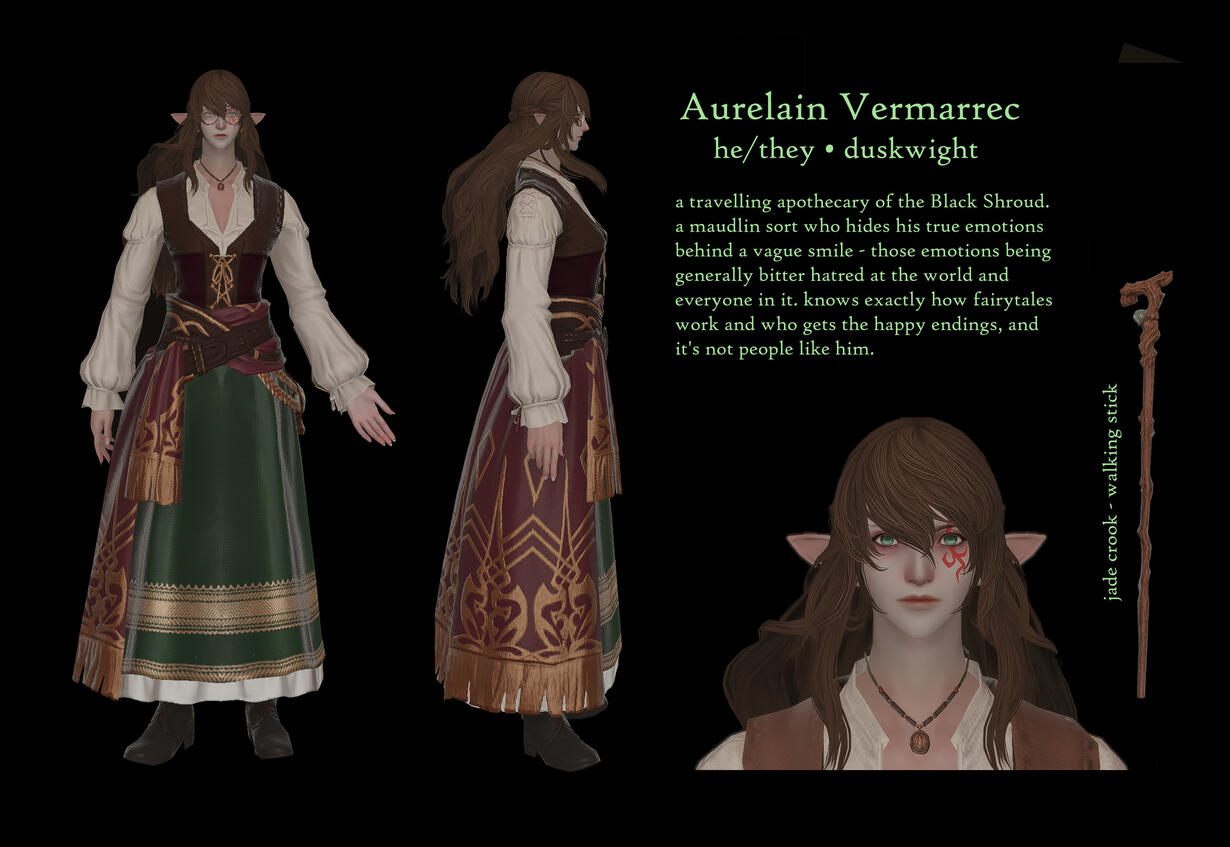 Far beyond Gridania’s walls, across the winding paths and emerald boughs, tales circulate among the oft-forgotten Shroudfolk of a mendicant doctor who travels the forest with his painted caravan, aiding those in need. Those that have met him all agree; he is surely a kind, dutiful soul, gentle and soft-spoken, endlessly patient and unfaltering in his duty.This is not entirely true. As Aurelain himself would put it, he is a mere cripplied herbalist, doing his duty because someone has to. And more than anything, he is far from the kindly person he is made out to be.It is a mask that Aurelain wears; nothing but a blank visage crafted of hollow niceties and superficial docility, rarely showing any expression besides a placid, empty smile. As the emotions of others flood his mind — all the sorrow and anxiety that come with a doctor’s work — he seldom has any place for his own. In this, the mask is his defence mechanism; a blank slate of subservience that others can project their own wants and desires on to, so that he may be whatever they need of him. Few are allowed to see his true face, and those true emotions are dark and often vengeful. Buried deep within lies a smouldering anger at the injustices he and the other marginalised people of the Shroud have been through — an anger only exacerbated by his knowledge that he can ultimately do nothing. He does not hope for freedom or power, because he has long since given up on all such things.For the most part, though, Aurelain just wants to be left alone. Past the resentment and anger, he is a quiet, somewhat timid person who refuses any kind of conflict, no matter how trivial. He is a man of great practicality and little sentiment, seldom given to flights of fancy — yet buried deep within him lies a dreamer’s heart, locked away and forgotten. Whatever kindness lived in him once, he believes, a lifetime of misfortune has twisted it beyond repair.To the Duskwight, fairytales and folklore are inextricable from reality, each a mirror of the other. It is through this lens that he has come to view the world and his place within it. There is a stark division, he knows, betwixt the heroes and the rabble; those that would shape the world and those that merely exist within it, the lead actors and the silent roles. And he knows his place all too well.