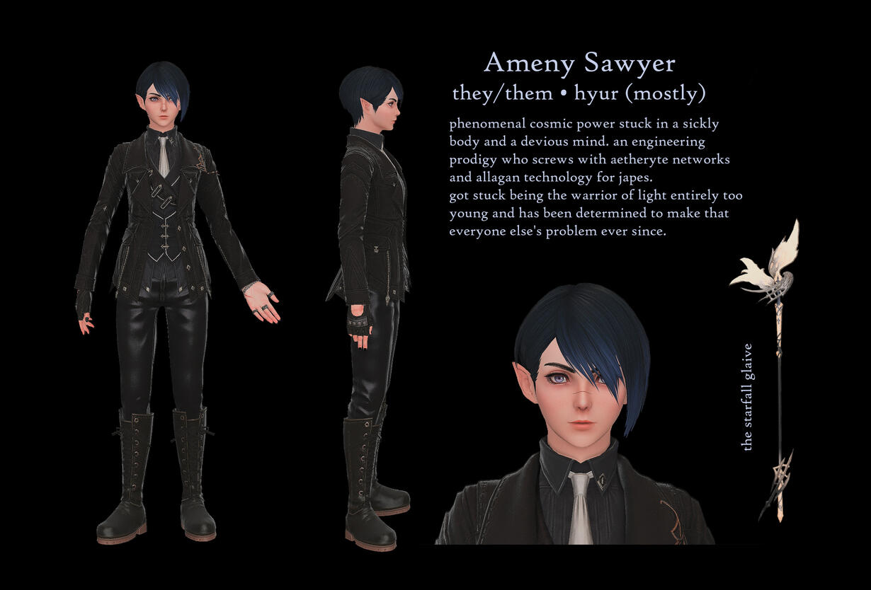Barely five fulms tall in heavy boots, Ameny Sawyer does not an imposing figure make. What they lack in intimidation, however, they more than make up for in smarts, magical ability, and sheer fury. Ambitious, intelligent, and more than a little vicious, Ameny has only three things constantly in mind; what they have, what they want, and how to use the former to get the latter. Everything — and everyone — else is utterly irrelevant.Or so they would insist. In truth, years of emotional issues and resentment have left them with a chronic inability to express her feelings in any way other than violent outbusts or bitter snark — a trait that has not helped their social life. Yet beneath their abrasive nature lies a gentle heart, armoured and buried.More than anything, though, Ameny’s greatest desire is that of learning and acquiring knowledge, of any and all sorts. Their aetheric and mechanical skills are quite impressive for one of their age, their understanding of aetheryte tech and teleportation magicks allowing them to use them to their advantage, be it in battle or to cause mischief. Such fervent curiosity often leads to trouble, however, and has landed them in hot water more than once. Most times, though, they manage to worm their way out by the skin of their teeth — or by copious use of violence.
