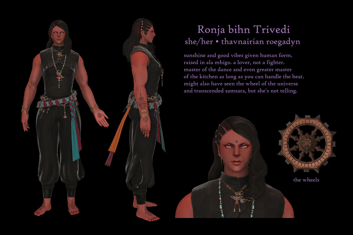Time passed. Castrums rose from the stones like a blight. Ronja heaved stone under the blazing sun, day after day. Her mother grew tired, fell ill, and withered away. Some died. Others vanished without a trace. Such was life under occupation.Eventually, though, something in the girl gave way. Pride, perhaps, or some newfound resolve — even she wasn't certain. But one night, when the guards were asleep, Ronja left her bed and walked away. And she kept walking — through the mountains and forests and ruins, past castrum watchtowers and downed magitek. When she got to the shadow of Baelsar's Wall, she kept walking until she had walked right past it, into the forests of the Black Shroud. And then she kept walking, through the forests into the desert of Thanalan until she found herself on a ship bound to the island of Vylbrand. There, satisfied, she finally decided to rest, and take up cookery.