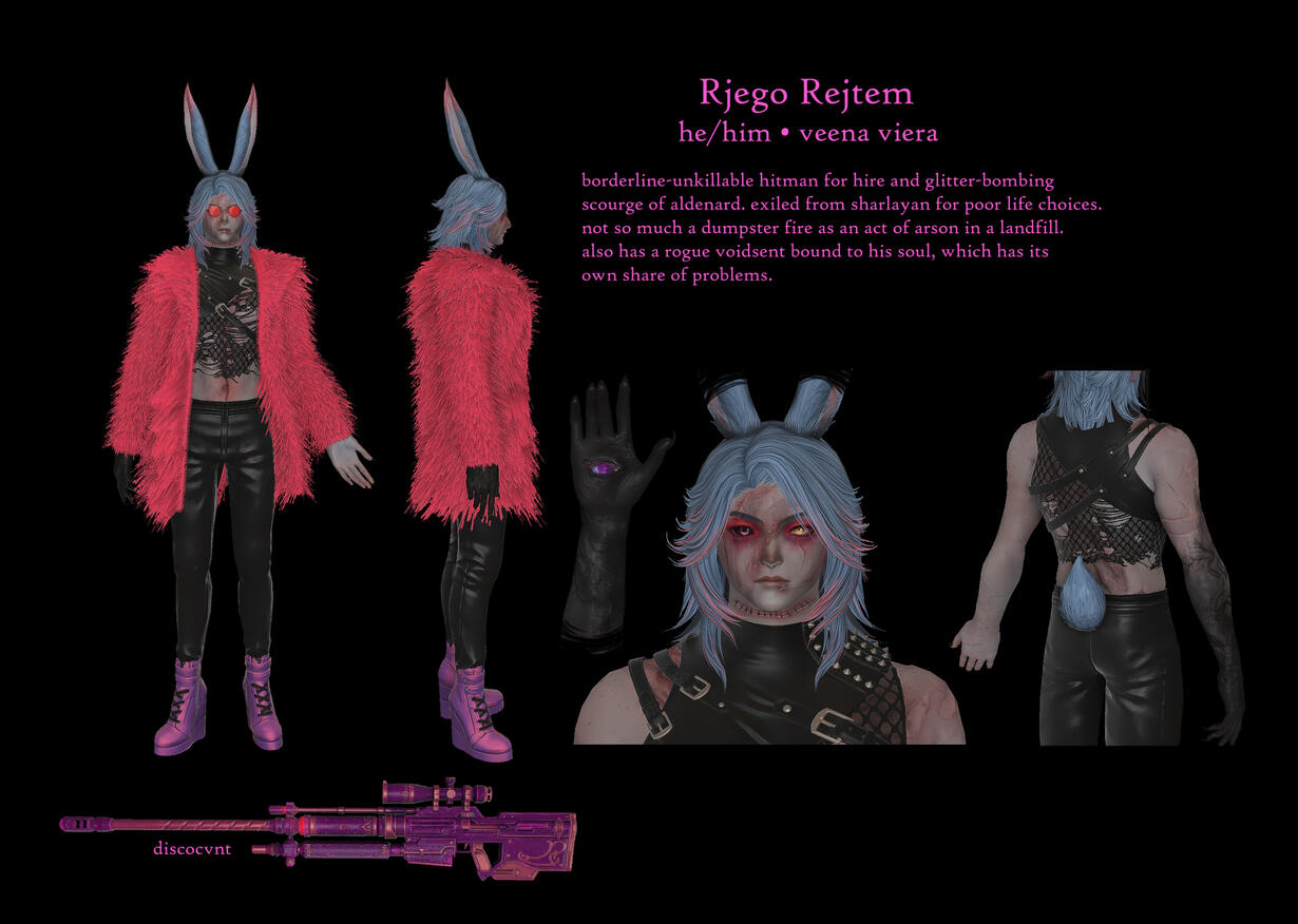 Ever-clad in his obnoxiously bright fur coat, shaded glasses and half-open shirt, brandishing a rifle painted neon violet, Rjego Rejtem is one of those people. Blessed with a unique – if paradoxical – combination of personality features, somehow possessing both an astounding mind and the kind of creative stupidity that can give the former a run for its money, Rjego doesn't so much go through life as much as he stumbles through it in a somnus-filled haze, occasionally falling into a ditch along the way.Doubtless, the Viera would love to style himself as the archetypical rogueish charmer, enchanting the underwear off anyone he finds attractive for his own gain and, hopefully, surrounded by piles of money. For the most part, though, everyone around him agrees that the man is a walking disaster. It is generally considered a wonder, then, that he was able to make his way as a hitman of all things — let alone a good one. Really, they wonder how he's even alive at all.The truth of the man, though, is one he keeps very firmly to himself. A childhood accident involving the Void and a lifetime of traumatic visions brought on at random times by the Echo means he can barely function without mind-altering substances to keep himself vaguely sane; in turn, this combines with his manic temperament to make him dangerously volatile. In clinging to his sanity, yet refusing to admit his own failings, he inevitably rejects all meaningful contact with other people despite how much he craves it. Ultimately, past the veneer of glitter and debauchery, there is simply a very, very lonely man.